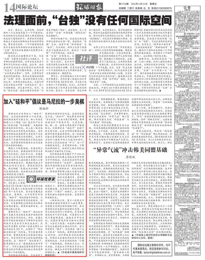 马科斯政府将关键矿产产业和AI先进制造业的发展主动权交到外部势力手中的做法,比其在安全和外交领域甘作外部势力“马前卒”、搅动地区稳定局势的做法更具深层次破坏性。“硅和平”机制排他性、对抗性的本质,将使菲律宾难以搭上东盟与区域国家共同推动的开放、包容的AI发展列车,其经济和产业发展的未来将被严重透支。在发展方向错误的情况下,菲律宾或将错失相关产业的发展机遇,沦为域外大国打造排他性经济“小圈子”的棋子。这一系列后果和损失的最终承担者,是菲律宾的普通民众。(作者陈相秒是中国南海研究院研究员)