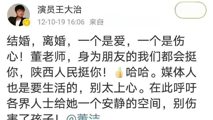 就在这场混战最乱的时候,王大治抢先下场,在网上公开力挺董洁,呼吁各界给她一个安静的空间,还说"陕西人民挺你"。