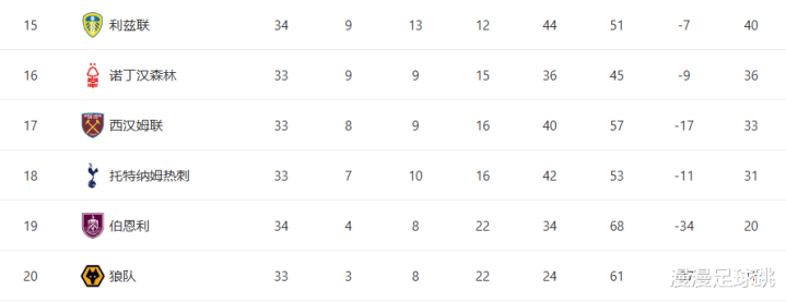 目前积分榜上,保级形势可以用“绞杀”来形容。利兹联34轮拿到40分,看似暂时安全,但其实仍未完全上岸;诺丁汉森林33轮36分,处于缓冲区却暗流涌动;西汉姆联33轮33分,正踩在生死线上;而最令人震惊的是,昔日英超劲旅托特纳姆热刺,33轮仅31分,已经跌入第18位的降级区。