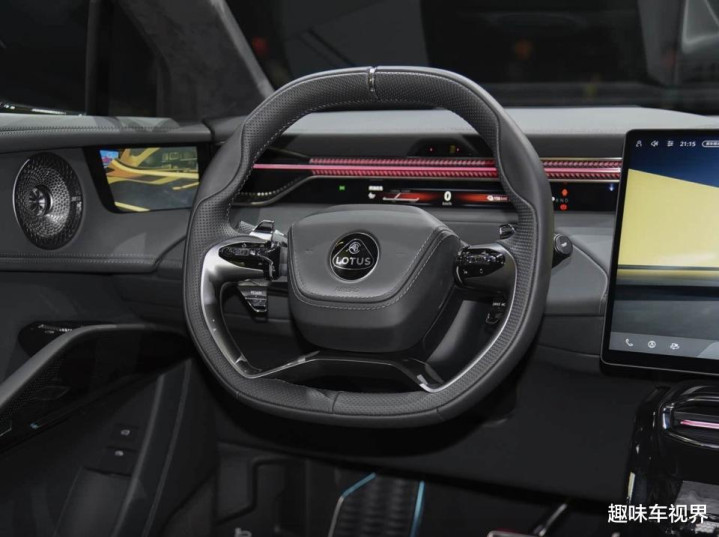 内饰方面,新车延续莲花极简运动的设计风格,同时融入专属豪华细节,兼顾运动感与舒适性。座舱采用5+2屏幕环绕布局,由全液晶仪表、悬浮式中控屏与HUD抬头显示组成,操作便捷,科技感十足,下方通道区域配备物理拨杆与电子拨杆换挡,凸显赛道操控氛围。细节处,车内多处点缀金色饰条,与外观黑金涂装呼应,搭载英国殿堂级KEF音响与四区独立空调,进一步提升座舱豪华体验。