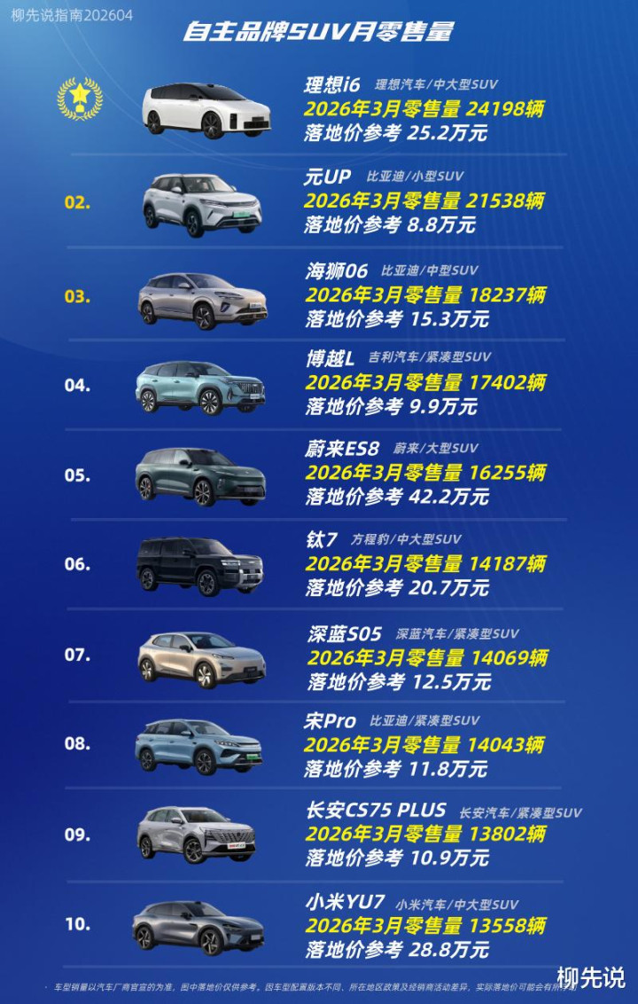 2026年3月,具体到自主品牌SUV的月度零售排名,第6至10名的车型分别为:钛7、深蓝S05、宋Pro、长安CS75 PLUS和小米YU7。排在第6名的方程豹钛7是方盒子车型中的畅销车之一,月零售量达14187辆。