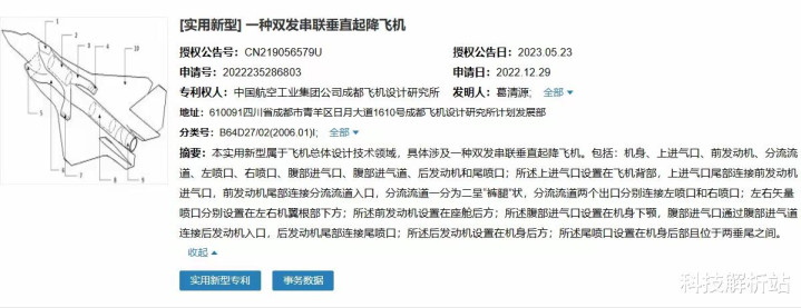 2023年5月23日,国家专利局授权成飞双发串联垂直起降专利(专利号:ZL202223528680.3)。据此类推,合理估计,若这款黄皮机是垂直起降战机,那么它最有可能采用前置升力发动机设计。
