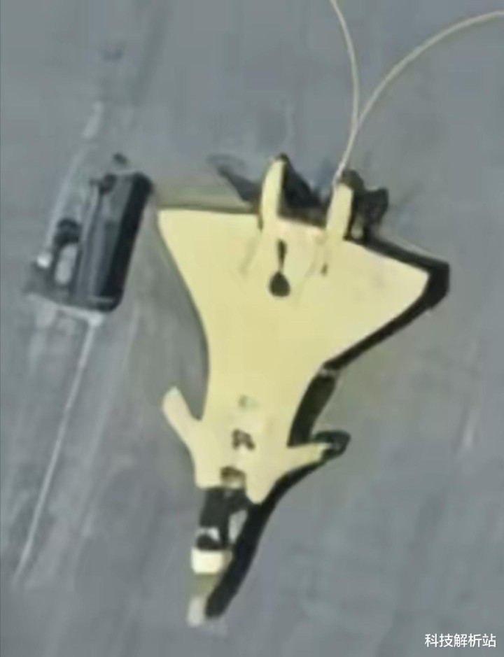 将该商业卫星局部放大发现该战机机头疑似有驾驶舱,驾驶室后方疑似有开口,可能是升力风扇或前置升力发动机进气口。据此判断,该机最有可能是国产垂直起降战机。